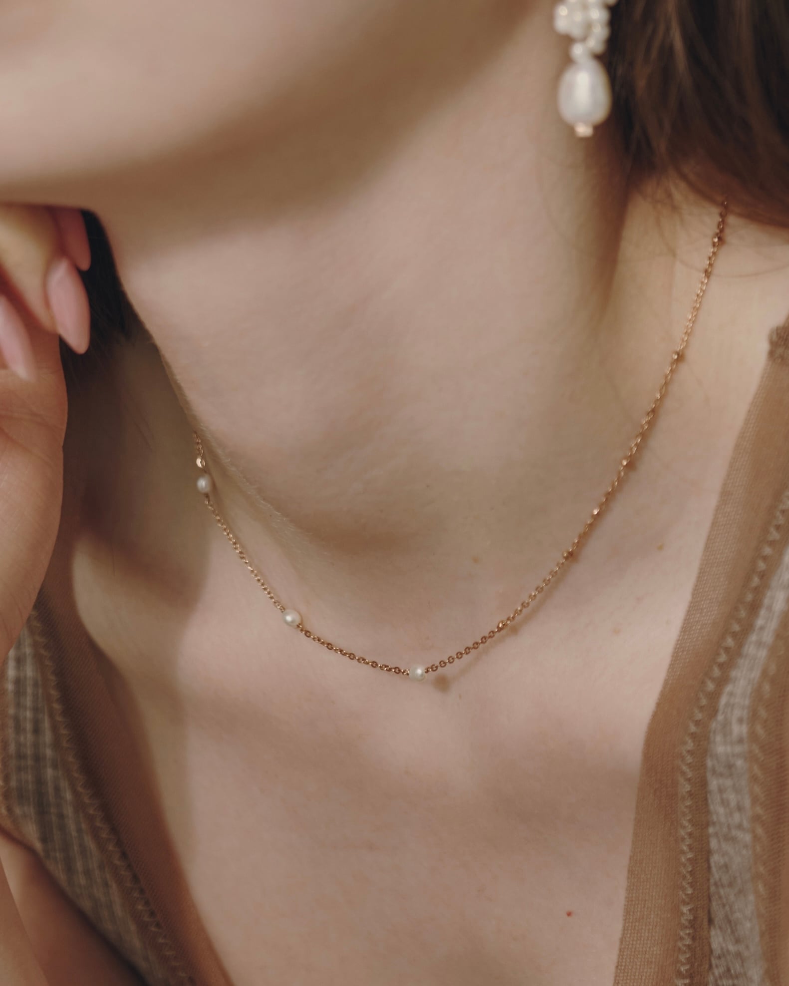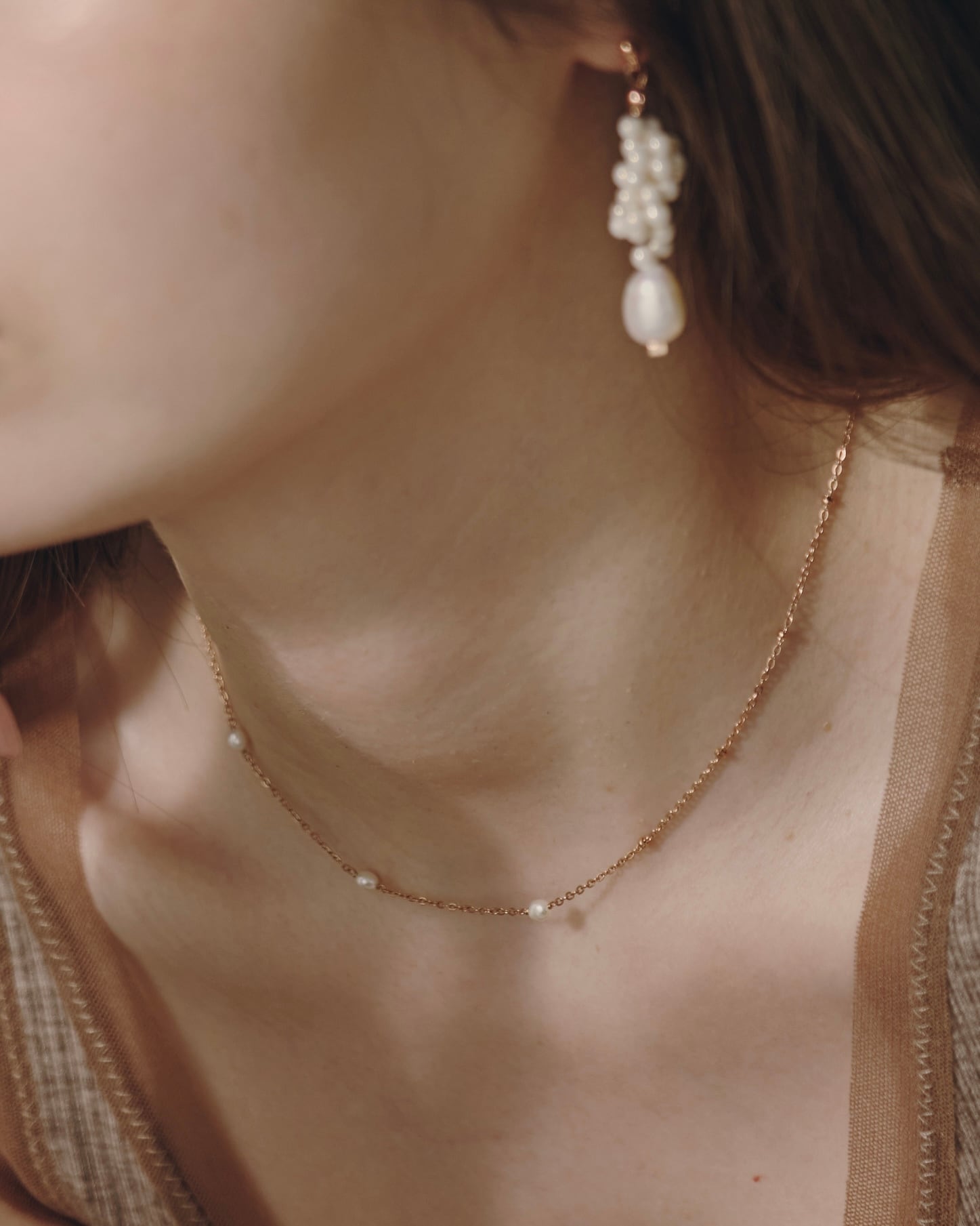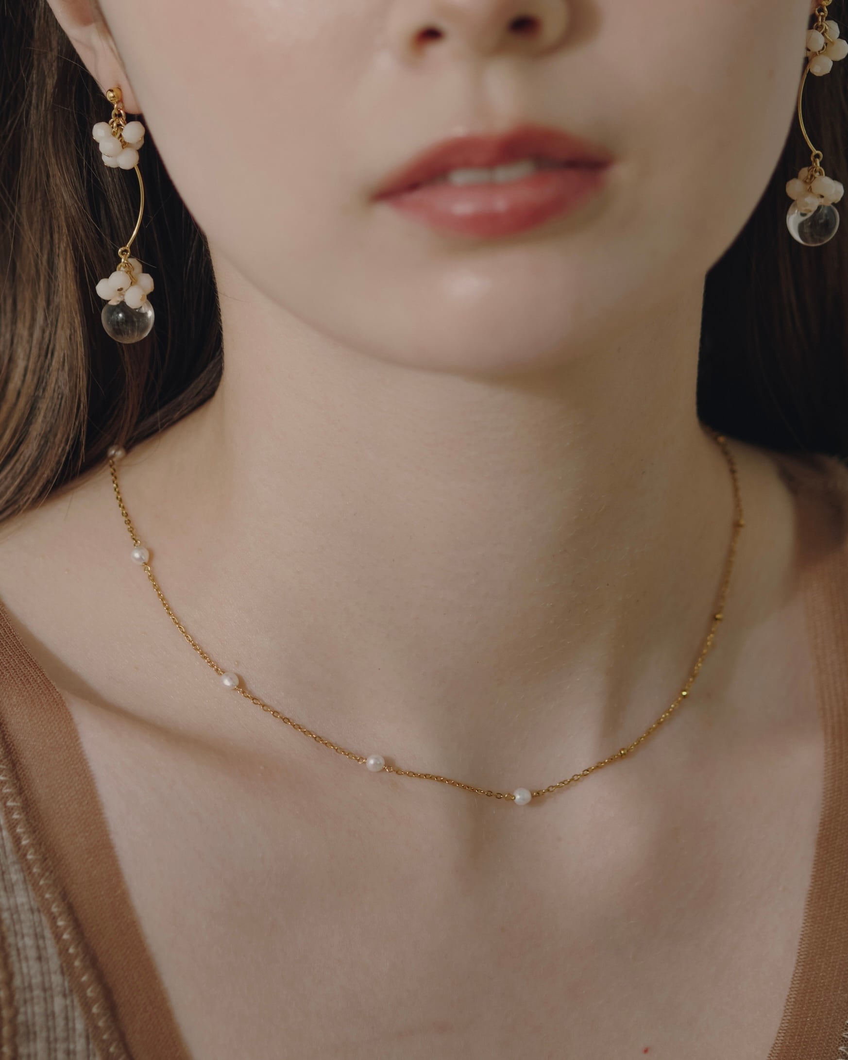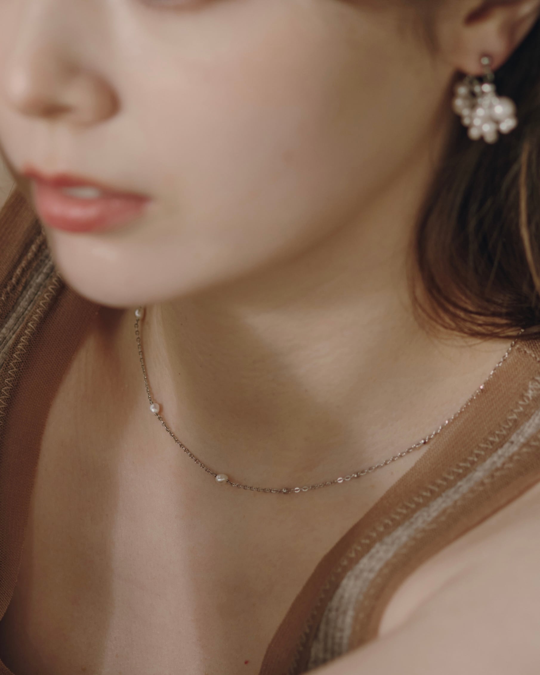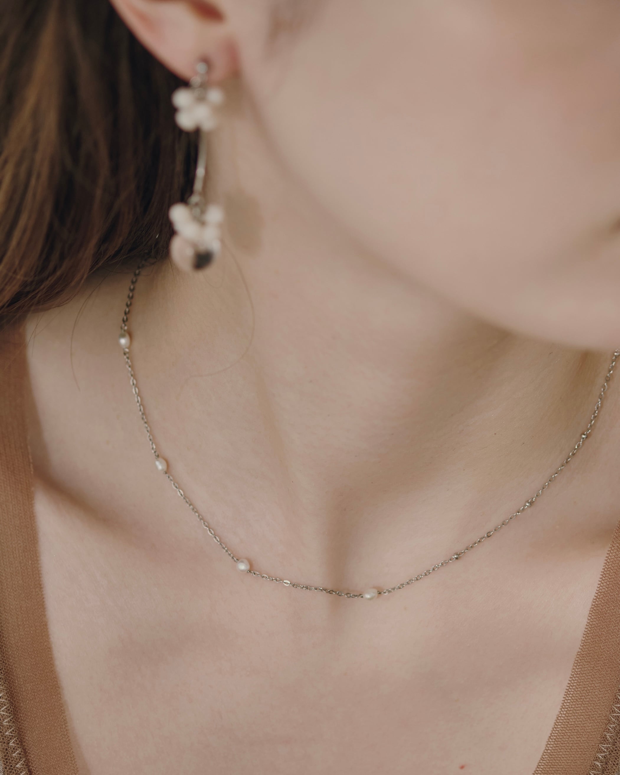 さりげなく光を集める粒とパールの艶が、白い花のまわりに漂う小さな光のように静かなきらめきを添え、首もとにやさしい余韻を残します。
