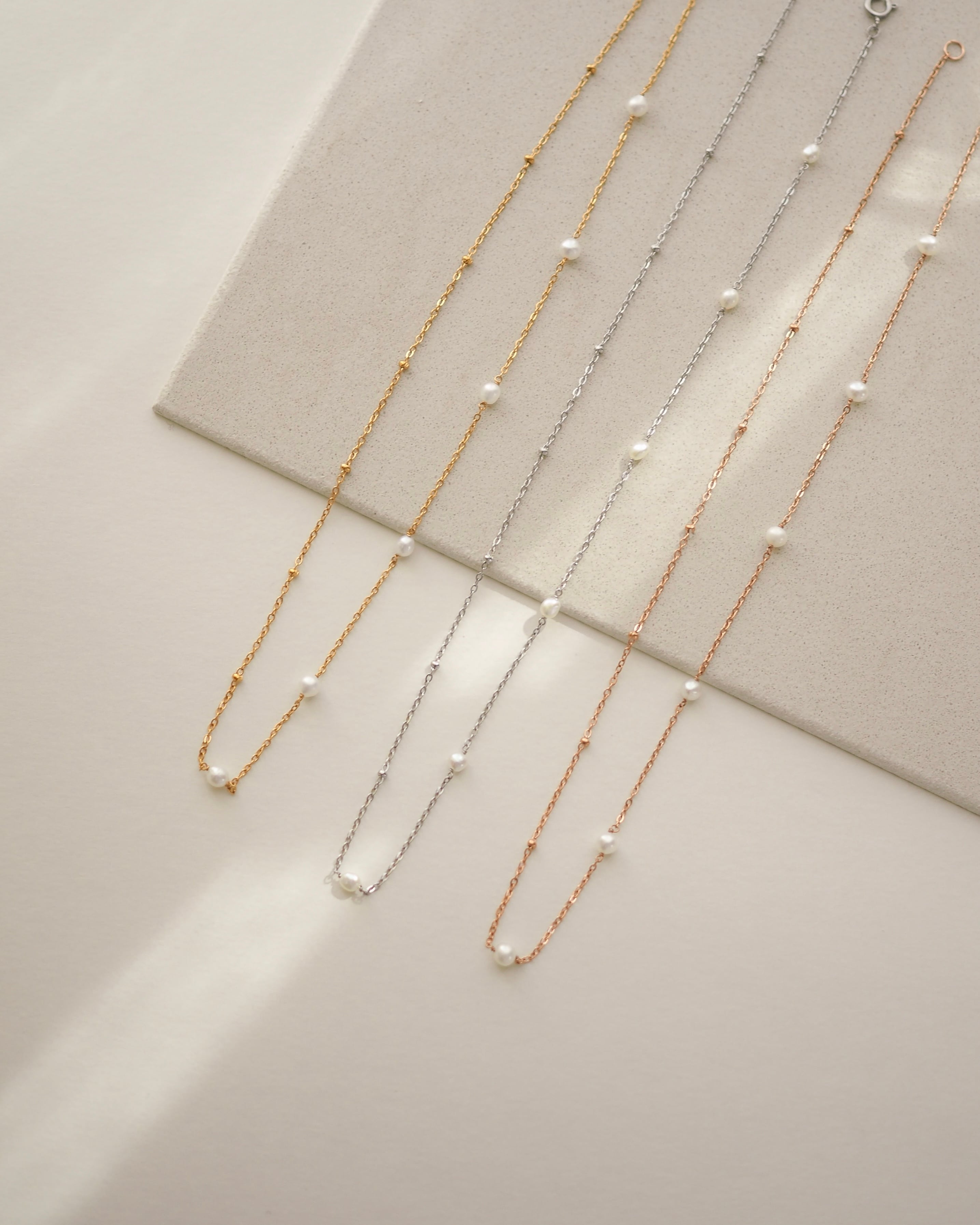 小さな粒を連ねたドットチェーンとパールを散りばめたチェーンを半分ずつつないだネックレス。