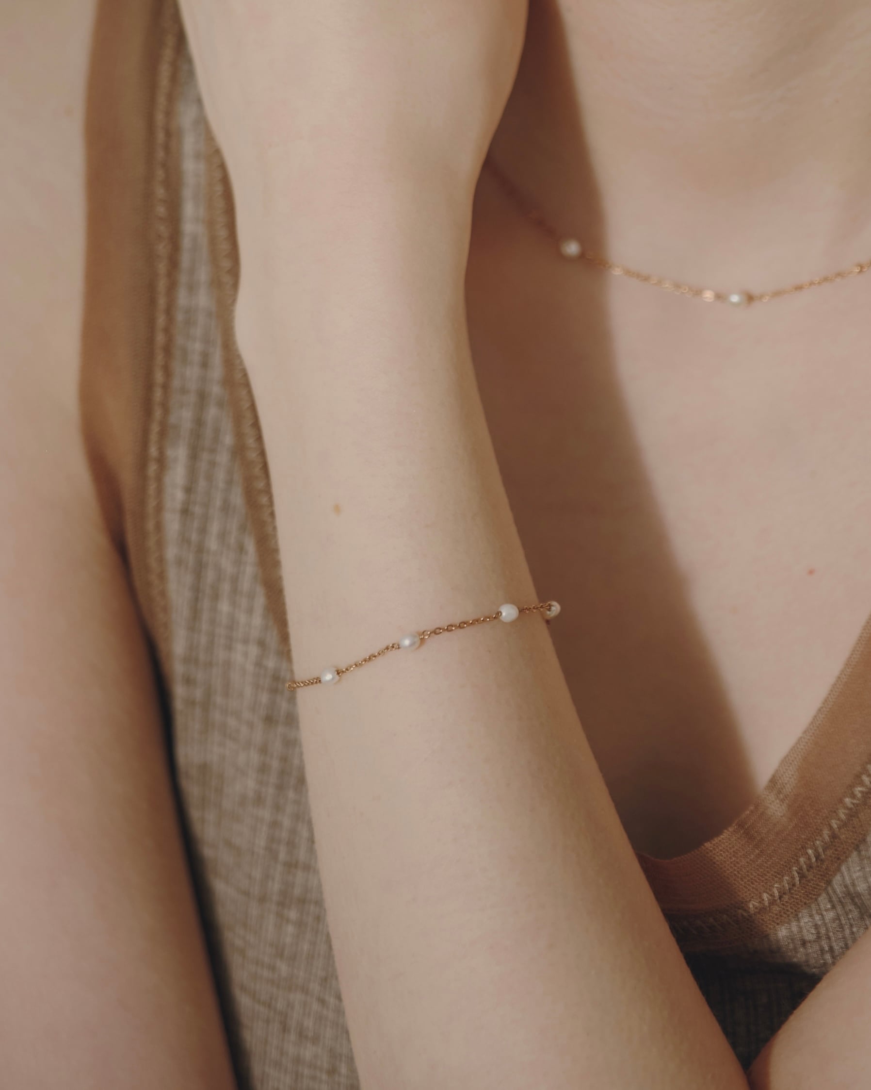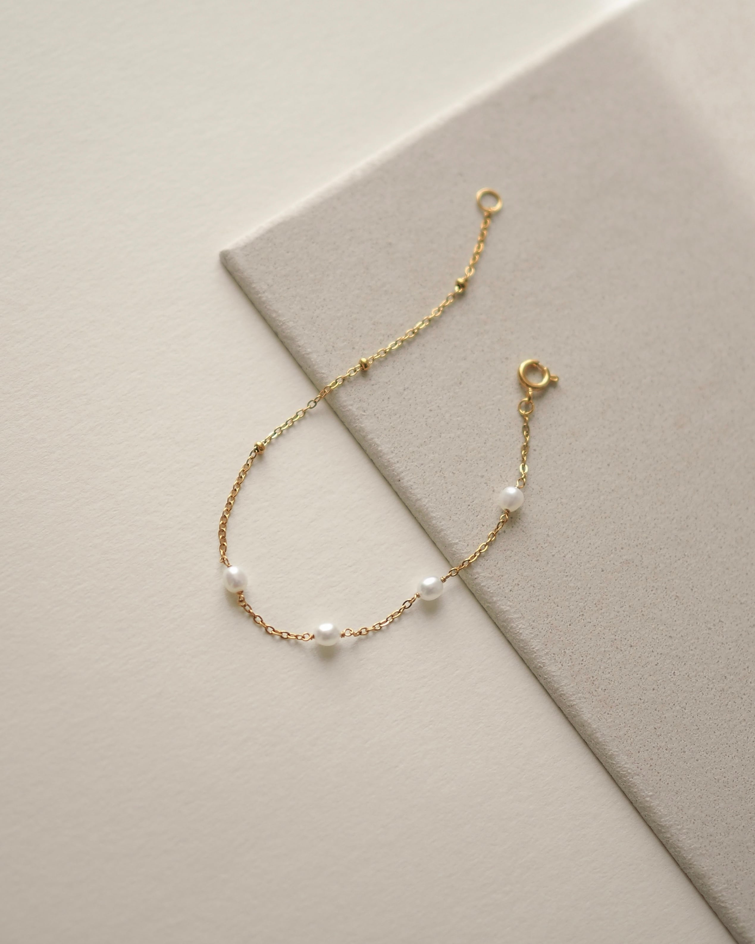小さな粒を連ねたドットチェーンと、パールを散りばめたチェーンを半分ずつつないだブレスレット。